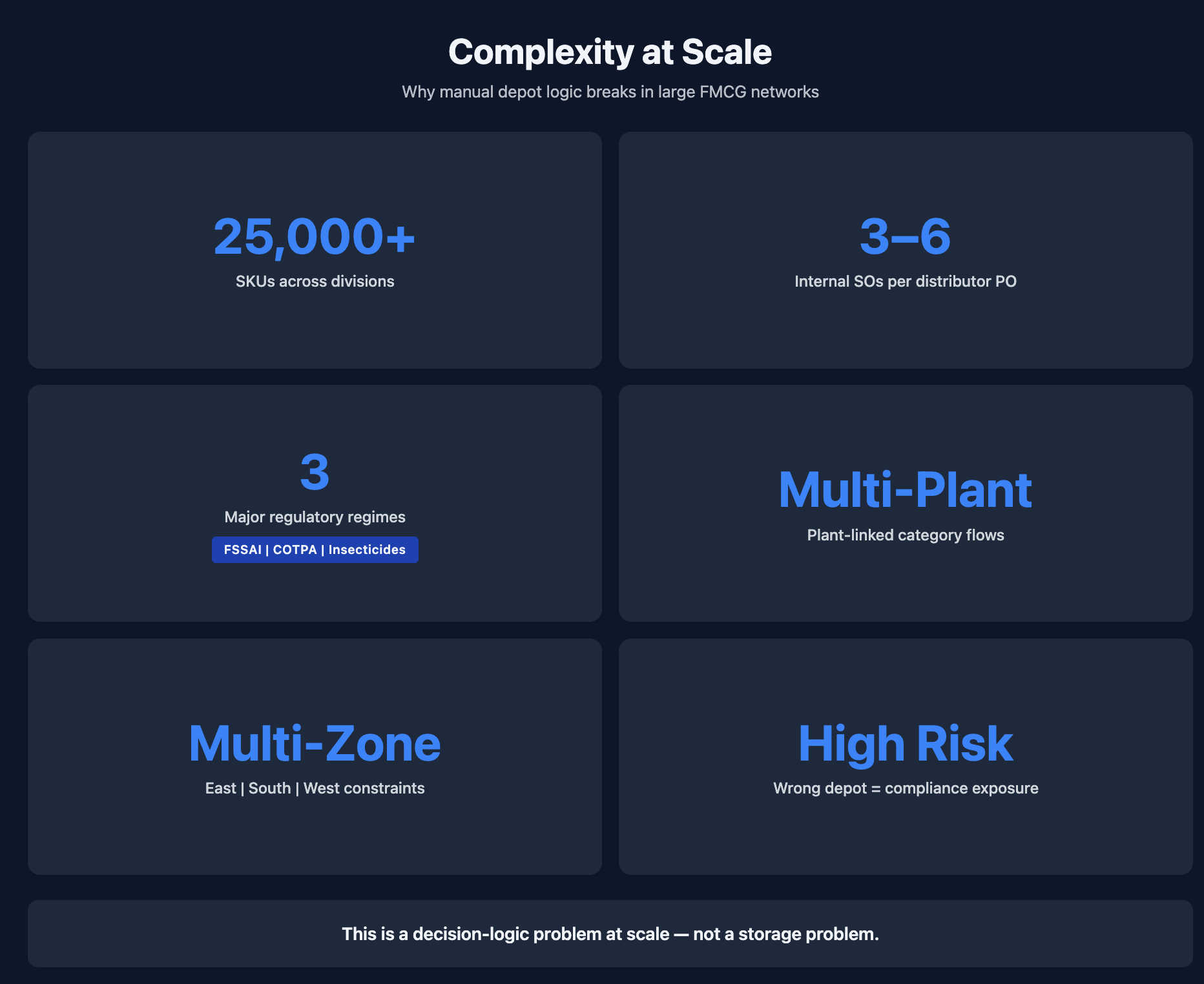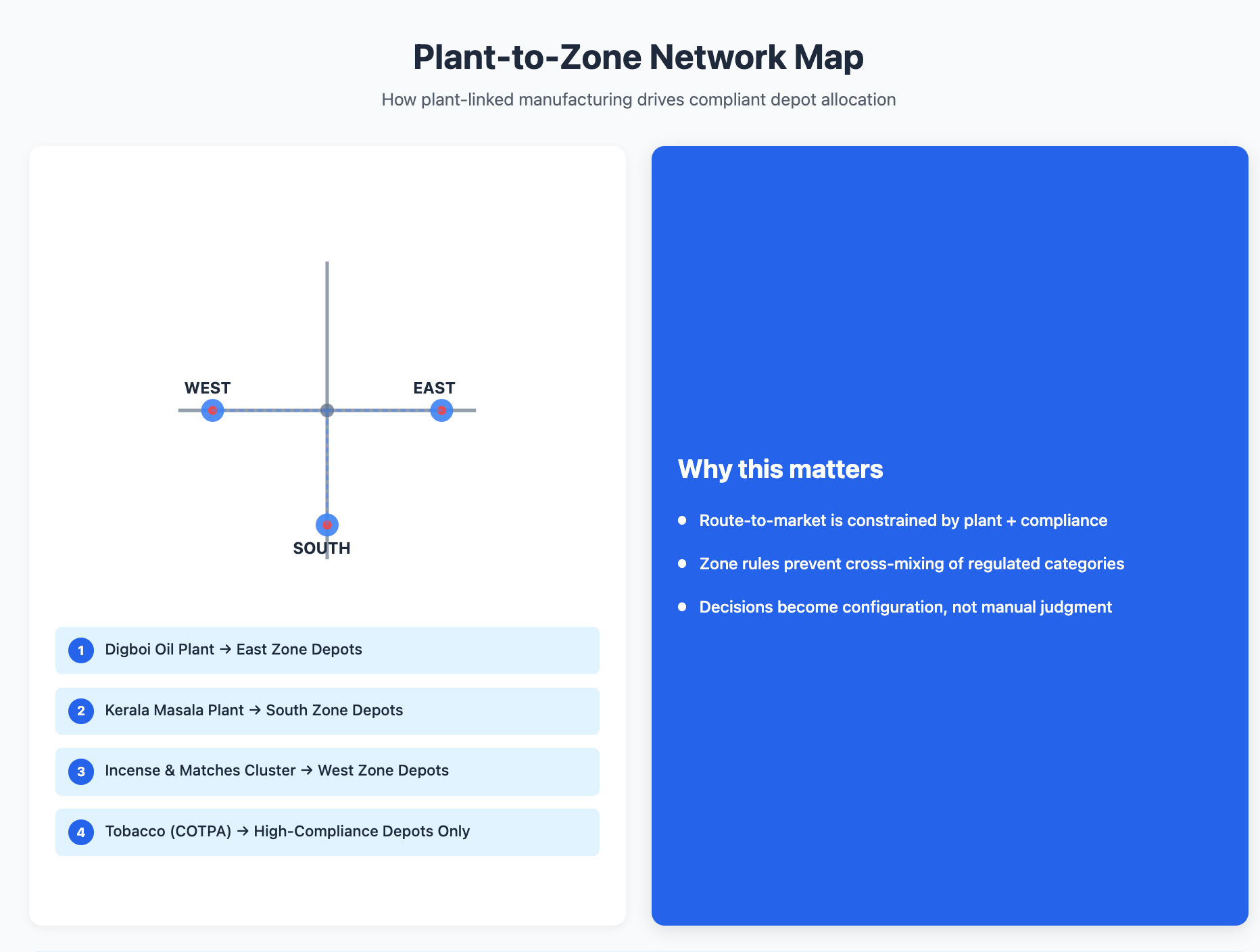 At the same time, the client’s network design was not “one warehouse serves all.” Several categories were plant-linked and zone-constrained: oils produced in Digboi flowed into East depots; Kerala plant masala blends fed South depots; incense sticks and matches were centralised in the West due to vendor proximity. Tobacco products were restricted to high-compliance depots.