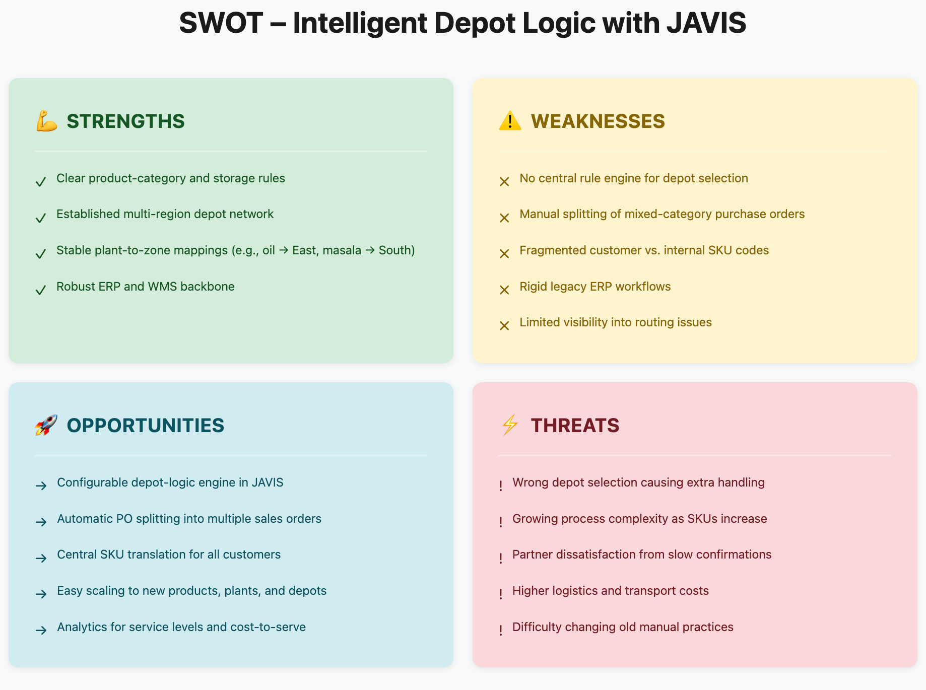 The stakes were clear: each incorrect depot decision was not just an operational error, it carried regulatory exposure and reputational risk. Yet even with modern ERP and WMS, depot assignment still depended on human interpretation because the underlying rule complexity lived outside the system.