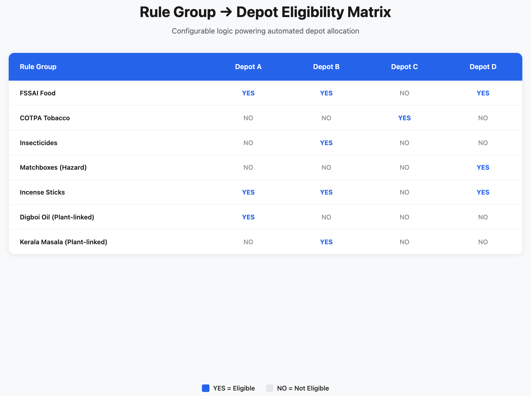 This creates a living eligibility matrix. Instead of humans remembering which depot can handle what, the engine enforces it.