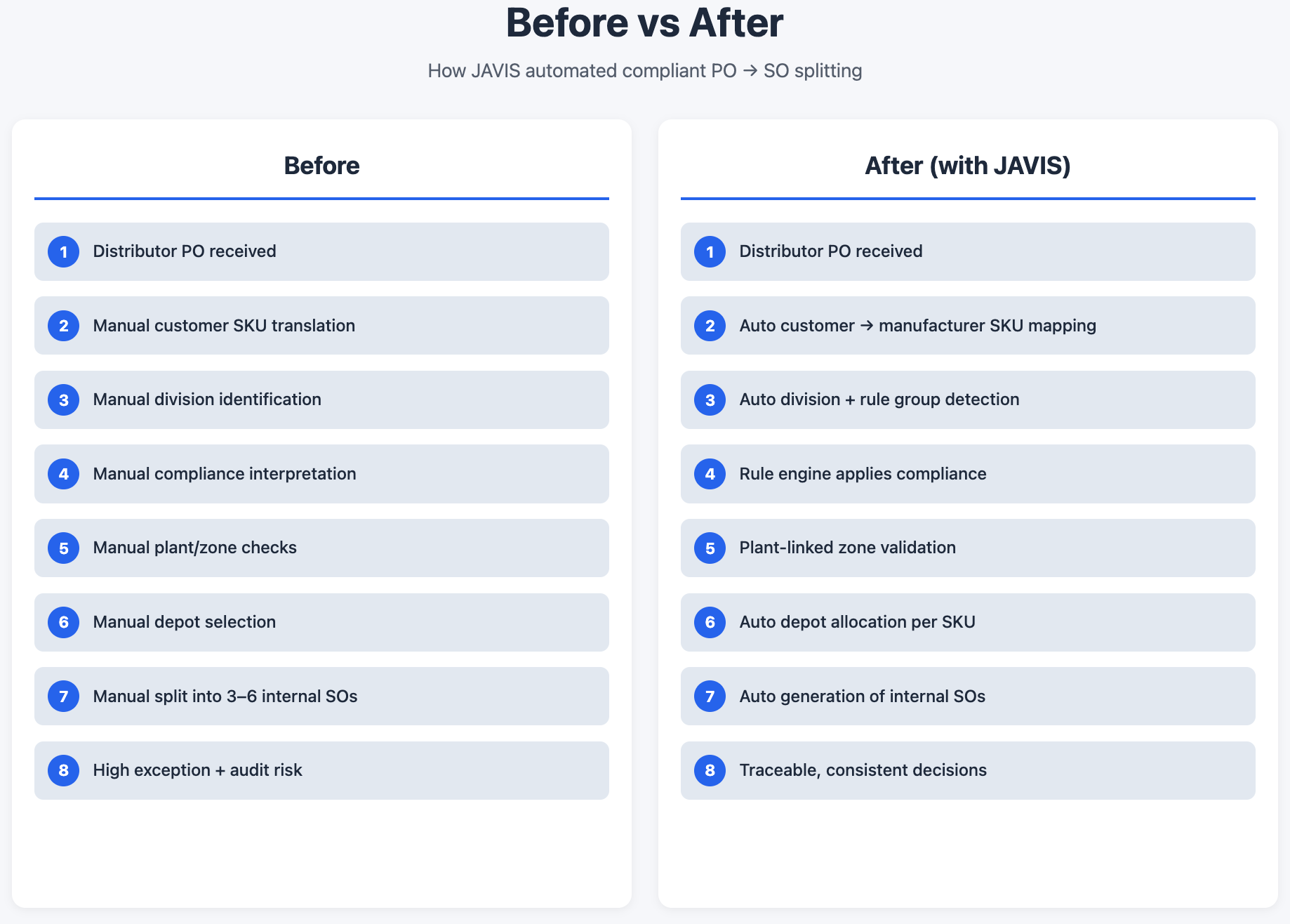 JAVIS became the “brain” that evaluates each distributor PO line-by-line, applies compliance and plant rules, then generates the right internal sales orders automatically.